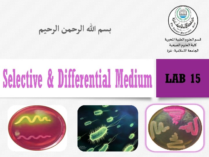 Introduction v In addition to general-purpose media, which allow the growth of most types of bacteria, microbiologists use specialized media to identify and/or isolate specific groups of bacteria. v. Selective and differential media are used to isolate or identify particular organisms. v Selective media allow certain types of organisms to grow, and inhibit the growth of other organisms. The selectivity is accomplished in several ways: § For example, organisms that can utilize a given sugar are easily screened by making that sugar the only carbon source in the medium.