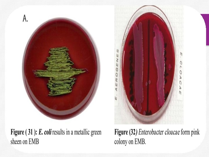 v. The eosin and methylene blue dyes cause lactose fermenters to have pink colonies. E. coli incorporates so much of the dye that the dyes precipitate in the cells and give the colonies a metallic green sheen. v Non-lactose fermenters will remain colorless or take on the color of the medium such as Salmonella (one of the causative agents of food poisoning). v Note: This media is used to confirm the presence of E. coli in water samples contaminated with sewage or fecal material. v You will use this agar again with in the water sampling experiment to differentiate between E. coli and Enterobacter.