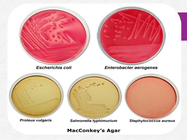 Mac. Conkey agar v Used to isolate Gram negative enterics (coliforms) v Selective and differential medium. v Selective - Gram positive bacteria are inhibited by the presence of bile salts and crystal violet inhibitors in the medium. Most of gram negative bacteria will grow. v Differentiate- Between Gram negative bacteria by their ability to ferment lactose.