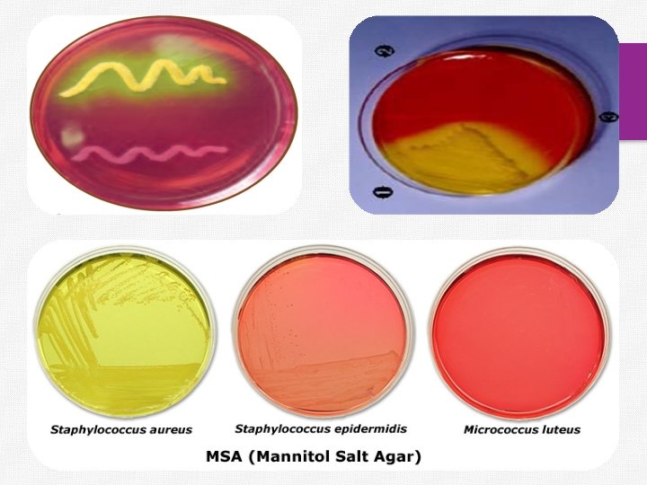 v On MSA, pathogenic Staphylococcus aureus produces small colonies surrounded by yellow zones. The reason for this change in color is that S. aureus ferments the mannitol, producing an acid, which, in turn, changes the indicator from red to yellow. v Other Staphylococcus don’t ferment mannitol don’t produce a color change from the normal red-pink color of the medium v The growth of other types of bacteria is generally inhibited. ü S. aureus = salt tolerant; ferments mannitol (yellow) ü S. epidermidis = salt tolerant; does NOT ferment (red) ü M. luteus = not salt tolerant; does NOT grow on mannitol