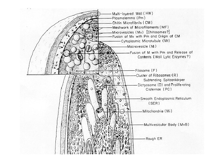 • • • Organelles typical eukaryote assemblage of organelles + fungal specific ones mitochondria endoplasmic reticulum Golgi equivalents single cisternal elements vacuoles microbodies funx in fatty acid degradation, N metabolism