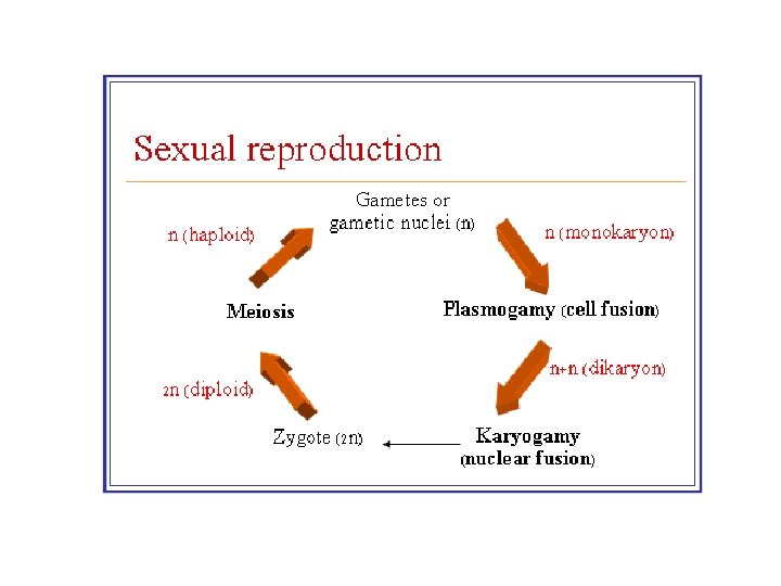 Fungal life cycles mitosis Life cycle is predominantly diploid (2 n) 2 n n Meiosis n n + n 2 n Karyogamy Plasmogamy