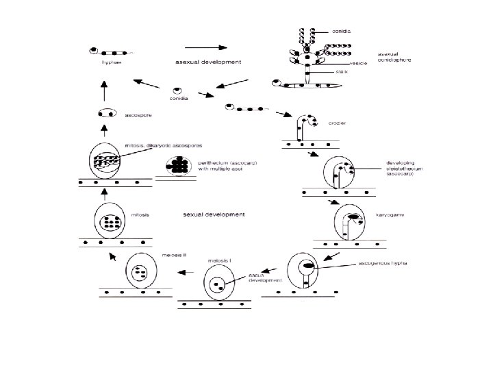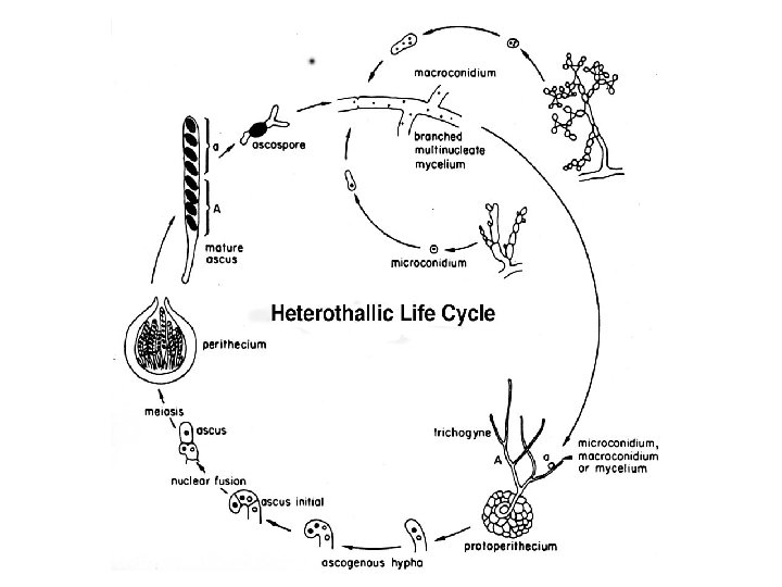 Reproduction • Sexual reproduction: spores meiotically derived nuclei • Homothallic (selfing) • Heterothallic (outcrossing) • Genetic mating system – MAT loci – 1 to hundreds of “sexes” • Asexual reproduction – Spores with mitotically derived nuclei
