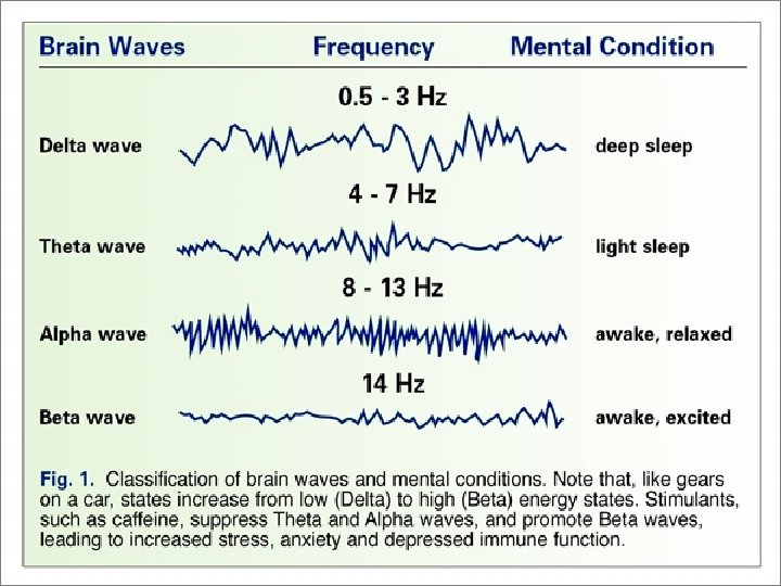 Research: Electrical Recordings Electroencephalograph (EEG) Monitors brainwave patterns produced by electrical activity on the surface of the brain EEG electrodes amplify electric potential Use? Sleep stages Seizure disorders Presence of tumors Active areas of brain