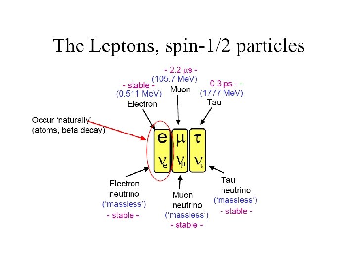 Who ordered that muon? (Rabi, 1936, NP ) Medellivstiden för myoner, upptäckta i den kosmiskastrålningen är 2, 2 mikrosekunder. Den negativt laddade myonen sönderfaller till en elektron, en antielektronneutrino och en myonneutrino. Den positivt laddade myonen (myonens antipartikel!) sönderfaller till en positron, en elektronneutrino och en antimyonneutrino. •