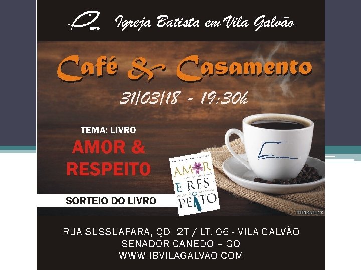 Em breve. . . Se você quiser trilhar este caminho em seu casamento, participe dos próximos “Café & Casamento”, baseado no livro “Amor e Respeito”. Igreja Batista em Vila Galvão