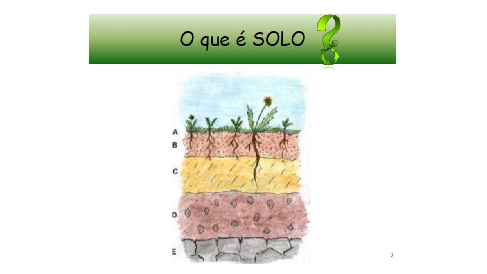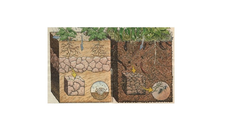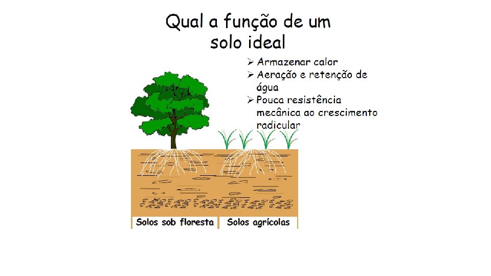 Funções do solo • Sustentar as plantas, fornecer água, nutrientes para as raízes; • Purificação da água; • Reciclagem de nutrientes: conversão em matéria orgânica; • Habitat e casa para os organismos: 1 grama de solo por conter milhões de organismos vivos e mortos; • Base para edificações: fornecer material (tijolos, madeira) para construções;