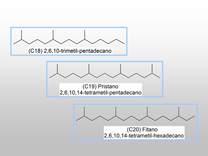 Hidrocarbonetos Parafínicos Ramificados • São os alcanos que apresentam ramificações em um ou mais átomos de carbono; • Também são conhecidos por Isoparafinas, isoalcanos ou parafinas ramificadas; • Destaque para os hidrocarbonetos isoprenóides.
