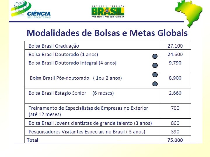 Financiamento da Pós-graduação Número de bolsas e investimentos diretos do CNPq em 2010 R$ Modalidades de bolsas de PG No país Mestrado Doutorado Pós-doutorado No exterior (todas as modalidades) Nº de bolsas Custo anual
