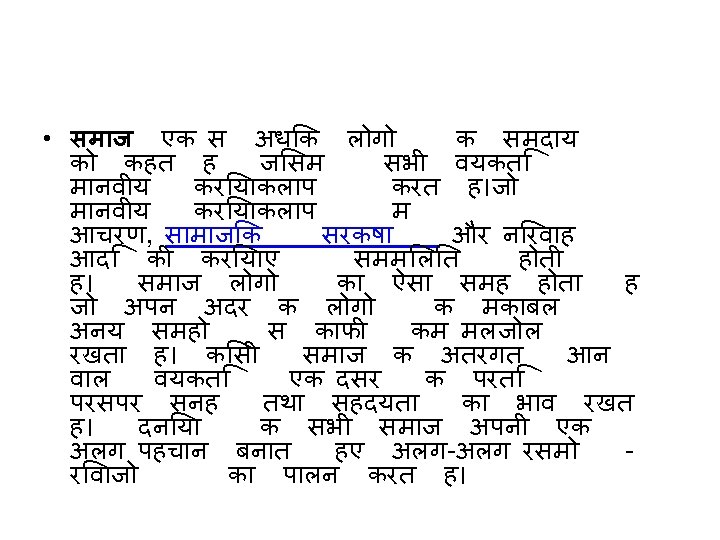 • It will be having likeness and differences. Due to these differences, variety in human behaviors and division of labor and specialization of roles is there. • "There is consciousness of kind. " Among the members of society. • It is always changing. • It has its own means to survive. • It is a self-sufficient social system. • It lasts for a longer period of time than groups and communities. • It will form a social structure through social institutions i. e. family, education economic, political and religious institutions. These basic five institutions are found in all societies of the world. • One of the characteristic of society has its own culture.