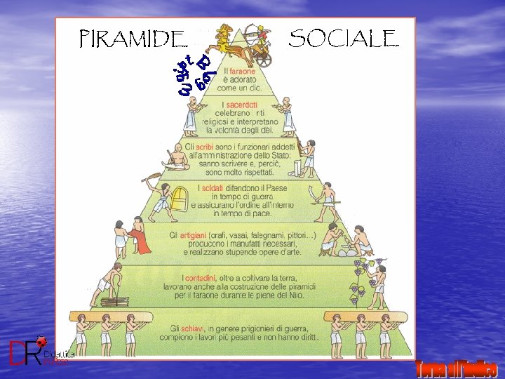Società Il popolo Egizio era diviso in classi sociali. Le classi erano molto rigide, non si poteva passare da una classe all’altra. Il faraone era considerato un dio. I sacerdoti si occupavano dei riti religiosi e delle inaugurazioni dei templi. I funzionari controllavano che tutti obbedissero agli ordini del faraone. Gli scribi erano gli unici a saper scrivere, per questo motivo erano molto importanti. I guerrieri difendevano il territorio dai popoli nemici. Gli artigiani erano falegnami, fornai, vasai, muratori … Alcuni producevano oggetti di uso quotidiano, altri si occupavano della costruzione delle tombe e dei decori che le adornavano. I mercanti viaggiavano per vendere e comperare merci. I contadini coltivavano la terra. I meno importanti erano gli schiavi che erano prigionieri di guerra e dovevano ubbidire al faraone e a chiunque li possedesse.