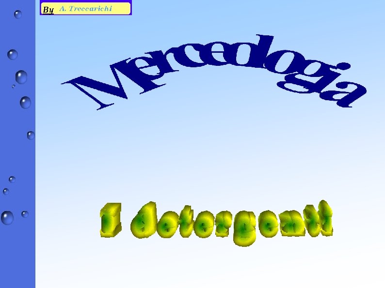 Terminologia (3) ¢ Tensioattivi: sostanze che diminuiscono la “tensione superficiale” ¢ Gruppo: " anionico: con carica negativa. " cationico: con carica positiva. " non ionico: senza carica specifica. ¢ Detergenti: miscugli di numerose sostanze con la predominanza dei tensioattivi. ¢ Idrofobo: contrario all'acqua, non solubile in acqua. ¢ Idrofilo: simile all'acqua, solubile nell'acqua