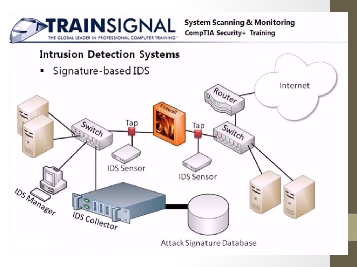 Benefits of IDS • Eliminate the need to shut down a network when an attack occurs • Allows user to observe the type of attack and methods used by the attack to prevent future attacks • The security baseline defines the criteria such as used bandwidth, protocols, ports, and the types of devices that can be connected to each-other.