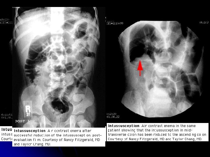 Diagnosis & Treatment l (3 -3) High risk cases: l symptoms longer than 48 hours l Infant < 1 y/o (esp. <3 m/o) l children > 5 y/o, and when plain films show signs of intestinal obstruction Recurrance rate: approximately 10% l Surgery l