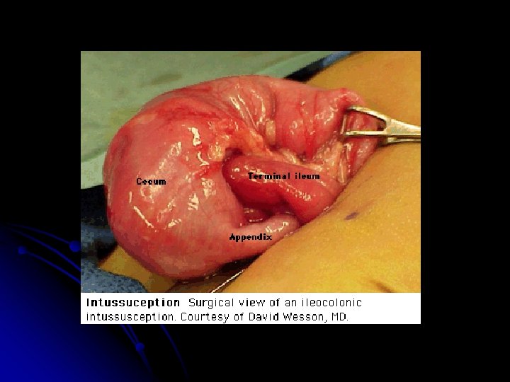 Pathogenesis (2 -1) Most common: ileo-colic type others: ileo-colic, jejuno-jejunal, jejuno -ileal, or colo-colic intussusception l Intussusception is considered to be idiopathic (ie, no lead point can be identified) in more than 75 percent of children with ileo-colic intussusception. l
