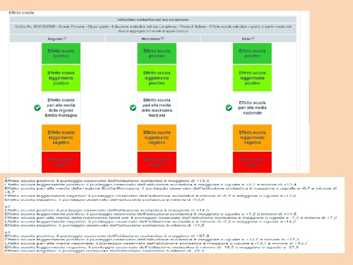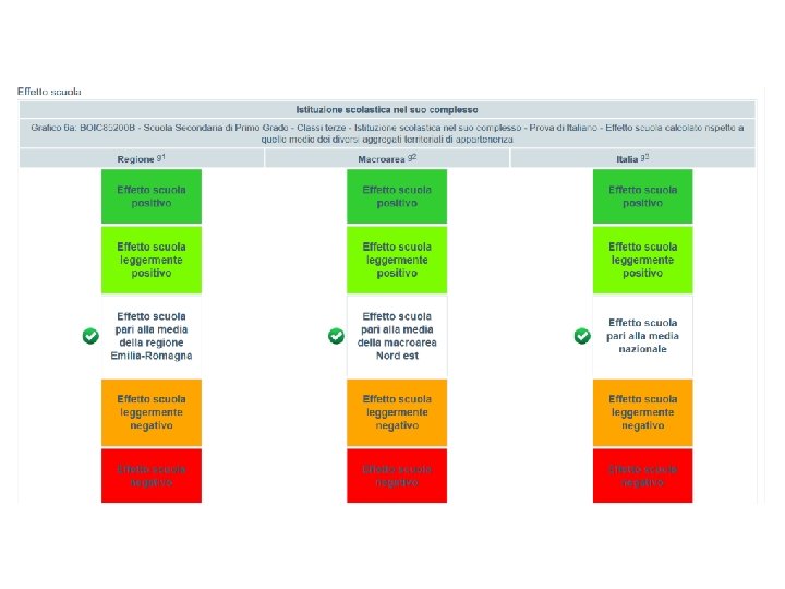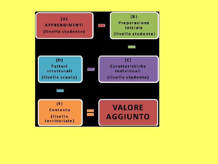 EFFETTO SCUOLA Quella del valore aggiunto, è una misura di quanto ciascuna scuola aggiunge al livello di apprendimento conseguito dai propri allievi tenendo conto della preparazione pregressa degli studenti in entrata e delle loro caratteristiche (come il background socio-economico-culturale). Inoltre, il valore aggiunto è calcolato tenendo conto degli effetti (positivi o negativi) del contesto in cui opera la scuola. I modelli di valore aggiunto consentono di confrontare le scuole a parità di condizioni (…) evitando che queste si avvantaggino – o siano penalizzate – da quanto non è sotto il loro diretto controllo“. Quindi, in conclusione: vengono presi in considerazione in primis i risultati ottenuti su ogni singola materia (voti veri e propri). A questi voti sono “sottratti” i fattori di base “individuale” come il genere, l’origine immigrata, condizioni socio-economicheculturali, posticipatario, e i punteggi che si otterranno per fattori per così dire “strutturali”, ovvero relativi alla scuola e dei fattori di “contesto puramente territoriali”. Per calcolare il «valore aggiunto» si confrontano i livelli di partenza (misurati dalle prove di seconda elementare per gli alunni di quinta e da quelle di quinta elementare per gli alunni di terza media) e i livelli di arrivo dei ragazzi al netto del contesto sociodemografico di riferimento.