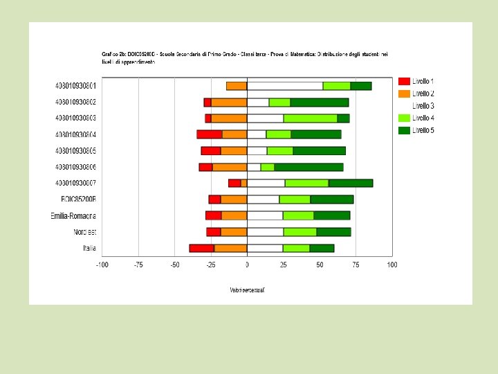 livelli di apprendimento Livello 1 punteggio minore o uguale al 75% della media nazionale Livello 2 punteggio maggiore del 75% e minore o uguale del 95% della media nazionale Livello 3 punteggio maggiore del 95% e minore o uguale del 110% della media nazionale Livello 4 punteggio maggiore del 110% e minore o uguale del 125% della media nazionale Livello 5 punteggio maggiore del 125% della media nazionale Restituzione dati 2018 per l'Istituzione scolastica BOIC 85200 B. Scuola Primaria - Classi seconde. Ruolo: Referente per la valutazione Tavola 4 B - Matematica - Distribuzione degli studenti per livelli di apprendimento (12) Istituzione scolastica nel suo complesso Classi Numero studenti livello 1 Numero studenti livello 2 Numero studenti livello 3 Numero studenti livello 4 Numero studenti livello 5 408010930201 5 2 4 3 3 408010930202 6 6 1 3 4 408010930203 2 5 8 408010930204 4 4 2 3 6 408010930205 0 1 2 0 15 Istituto/Dettaglio territoriale Percentuale studenti Percentuale livello 1 livello 2 studenti livello 3 Percentuale studenti livello 4 livello 5 BOIC 85200 B 18, 1% 17, 0% 11, 7% 14, 9% 38, 3% Emilia-Romagna 32, 3% 19, 0% 12, 7% 10, 0% 26, 1% Nord est 29, 2% 19, 0% 12, 6% 10, 6% 28, 7% Italia 30, 7% 18, 9% 11, 5% 10, 2% 28, 7%