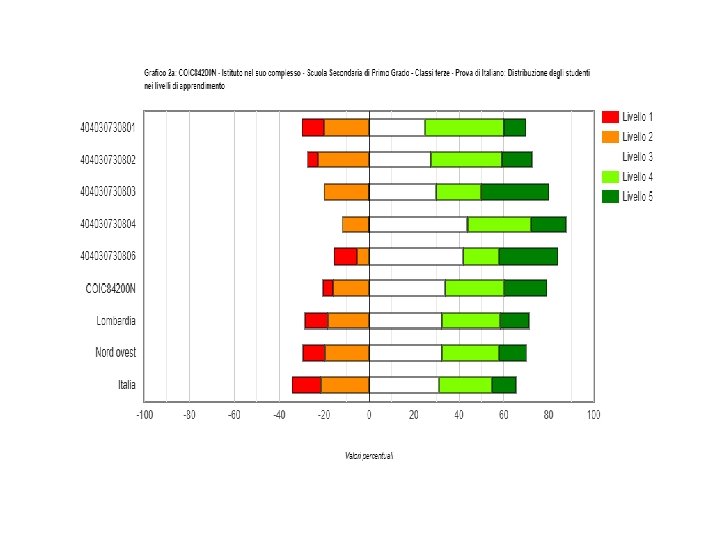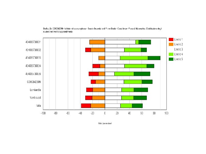Andamento anni cl 3 secondaria italiano Anno scolastico 2017 -18 2018 -19 Esiti degli studenti Percentuale studenti nella stessa scala del livello 1 livello 2 livello 3 livello 4 rapporto nazionale (1 d) Istituto COIC 8420 0 N Percentuale studenti livello 5 210, 3 6, 3% 13, 8% 33, 8% 12, 5% 211, 7 4, 7% 16, 0% 34, 0% 26, 4% 18, 9% Dati 2019 cl 3 secondaria italiano Classi/Istituto/Dettaglio territoriale Studenti livello 1 Studenti livello 2 Studenti livello 3 Studenti livello 4 Studenti livello 5 404030730801 2 (10, 0%) 4 (20, 0%) 5 (25, 0%) 7 (35, 0%) 2 (10, 0%) 404030730802 1 (4, 6%) 5 (22, 7%) 6 (27, 3%) 7 (31, 8%) 3 (13, 6%) 404030730803 0 (0, 0%) 4 (20, 0%) 6 (30, 0%) 404030730804 0 (0, 0%) 3 (12, 0%) 11 (44, 0%) 7 (28, 0%) 4 (16, 0%) 404030730806 2 (10, 5%) 1 (5, 3%) 8 (42, 1%) 3 (15, 8%) 5 (26, 3%) COIC 84200 N 5 (4, 7%) 17 (16, 0%) 36 (34, 0%) 28 (26, 4%) 20 (18, 9%) Lombardia 10, 1% 18, 5% 32, 3% 26, 3% 12, 8% Nord ovest 9, 9% 19, 8% 32, 3% 25, 6% 12, 3% Italia 12, 8% 21, 6% 31, 2% 23, 6% 10, 8%