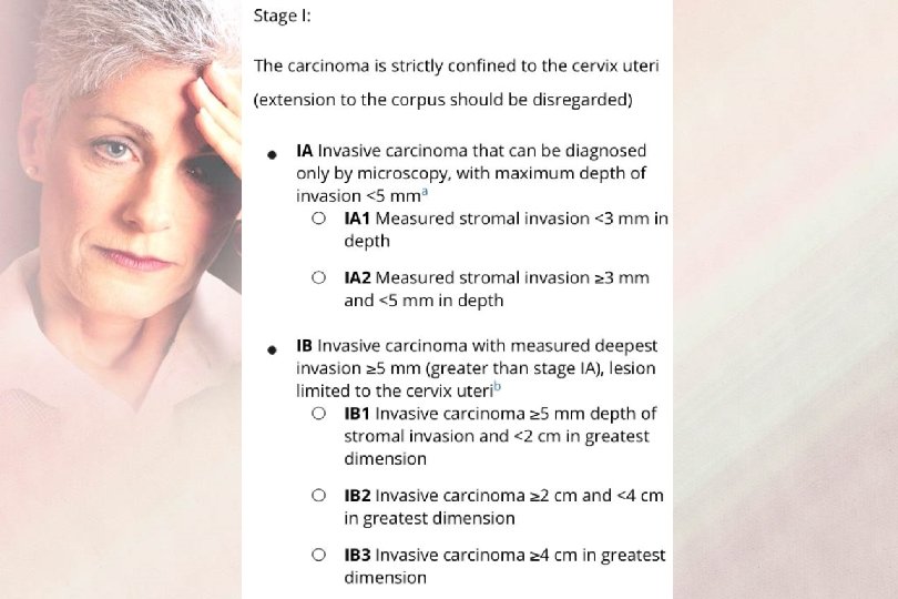 FIGO Staging 2019 Sage I : IB : Invasive lesion ≥ 5 mm depth or clinically visible lesion IB 1 : Carcinoma is less than 2 cm IB 2 : Carcinoma is ≥ 2 cm and less than 4 cm IB 3 : Carcinoma is ≥ 4 cm