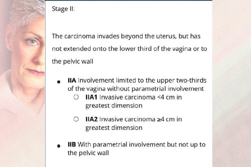 FIGO Staging 2019 Sage II : Carcinoma extends beyond the Cervix IIA : Extension to the upper 2/3 of the vagina IIA 1 : Carcinoma less than 4 cm IIA 2 : Carcinoma ≥ 4 cm IIB : Parametrial involvement