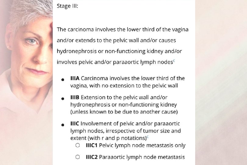 FIGO Staging 2019 Sage III : IIIA : Extension to the lower 1/3 of the vagina IIIB : Extension to the pelvic wall and/or hydronephrosis or non-functioning kidney IIIC : Nodal involvement IIIC 1: pelvic LN metastasis IIIC 2: paraaortic LN metastasis