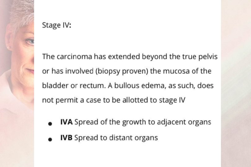 FIGO Staging 2019 Sage IV : Carcinoma extends beyond the true pelvis or invades the bladder and/or the rectal mucosa IVA : Invasion of the bladder and/ or the rectal mucosa IVB : Distant metastasis