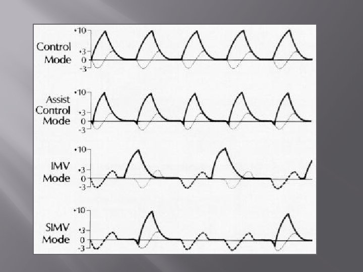 Modes of Mechanical Ventilation Spontaneous/Controlled/Dual Controlled Mechanical Ventilation (CMV) Assist Control (AC)/Volume Control (VC) Intermittent Mandatory Ventilation (SIMV) Pressure Control (PCV) Pressure Support Ventilation (PSV)