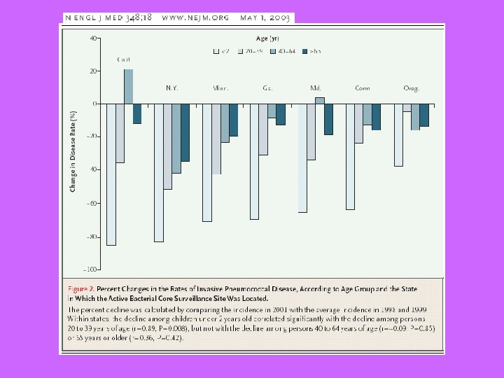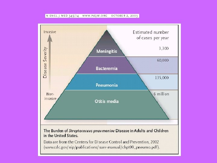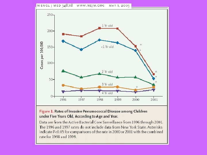 Conjugate Vaccine (2000) MMWR, 2000; 49 (No RR-9) • 7 serotypes of capsular polysaccharide (4, 9 V, 14, 19 F, 23 F, 18 C, 6 B) linked to a protein carrier • Recommended for: – Children < 23 months – Children 24 -59 months with • Sickle cell* or trait, beta-thalassemia, functional or anatomic asplenia* • HIV* • Chronic disease*, including chronic heart or lung disease, diabetes, or CSF leak; cochlear implant • Immunocompromising conditions* *revaccinate (23 -valent polysaccharide vaccine after age 2)