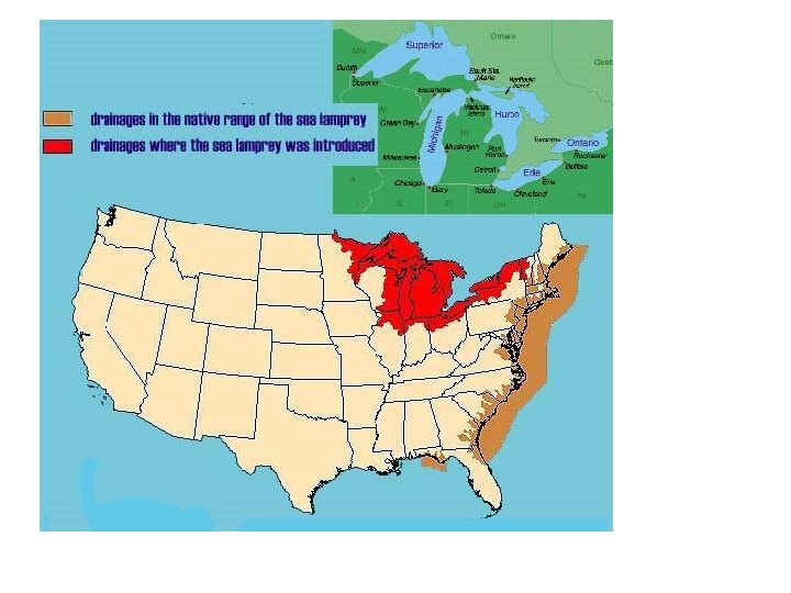 Sea Lamprey • Brought over from Europe on cargo ships the Sea Lamprey has killed many native fish in the Great Lakes