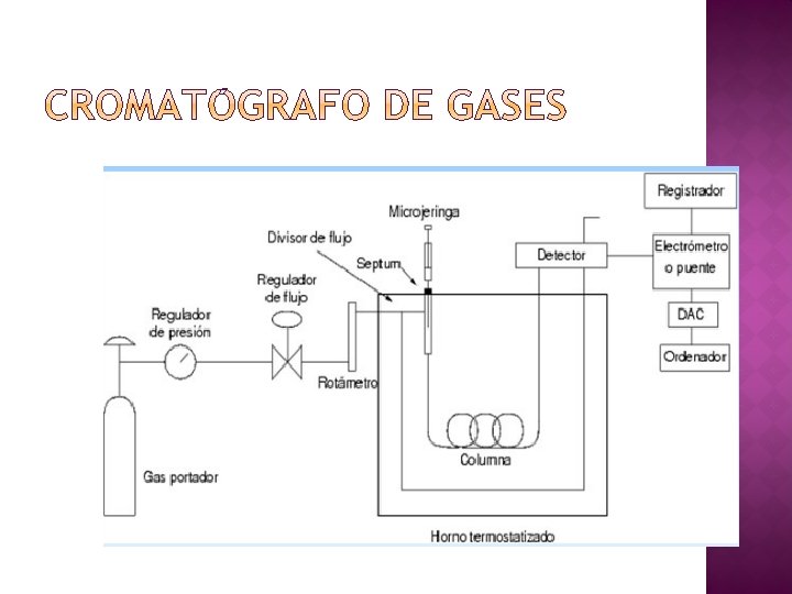 Gas portador: Medio de transporte de los componentes de la mezcla a través del sistema cromatográfico. Debe ser inerte: Ar, He, N 2 � � Columnas � Capilares: Sílice fundida. Diámetros interiores: 200 -250 mm. Longitud < 20 m. � Micro-empacadas � Tubulares abiertas � Empaquetadas Tubo de acero inoxidable, niquel o vidrio. Diámetros interiores 1, 6 -9 mm. Longitud > 3 m. Se rellenan de un material adsorbente adecuado.