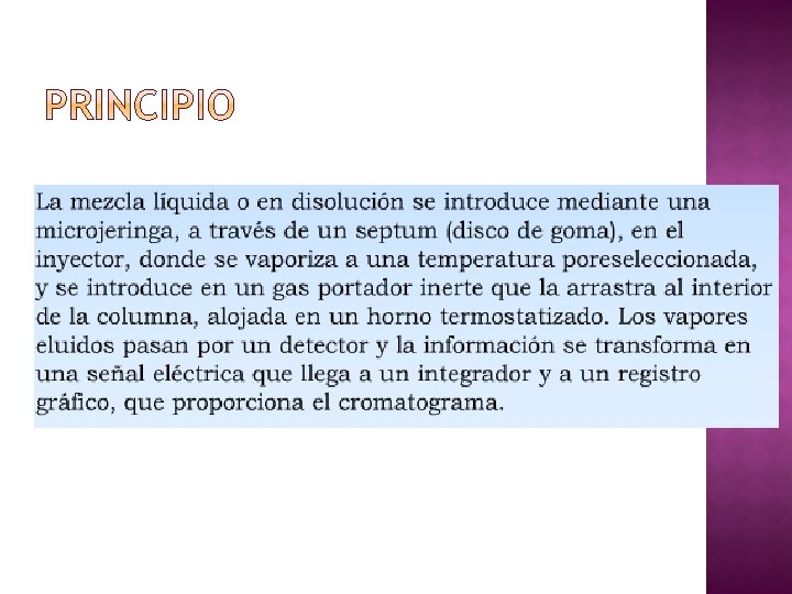 � Es la técnica para la separación de compuestos orgánicos e inorgánicos térmicamente estables y volátiles � Se produce como consecuencia de la interacción de los componentes de una mezcla vapor en una fase móvil gaseosa inerte, con una fase estacionaria (sólido/líquido) de alto punto de ebullición sobre un sólido inerte