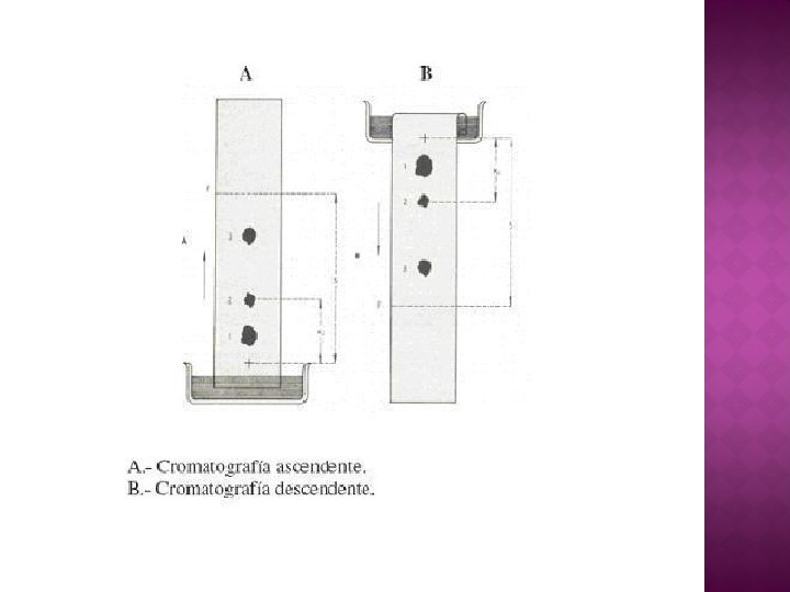 FE= papel de celulosa. FM= disolvente y la mezcla de varios líquidos que contiene agua. Se aplica la muestra sobre el papel Introducción del papel en la cubeta que contiene el disolvente. Éste atraviesa el papel por capilaridad arrastrando los componentes de la mezcla. Separación en función de la afinidad por las dos fases, las más solubles en agua se quedarán cerca del punto donde se aplicó la muestra, y las menos solubles en agua y más solubles en el disolvente llegarán más lejos. Las sustancias separadas se identifican mediante diversos procedimientos físicos o químicos.