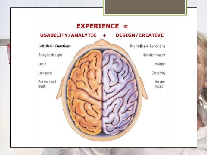 Right Brain Dominance Functions uses feeling "big picture" oriented imagination rules – creativity symbols and images spatial perception fantasy presents possibilities impulsive risk taking