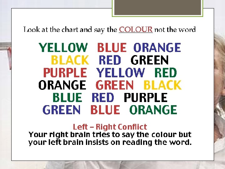 Left Brain Dominance Functions uses logic detail oriented facts “rule” words and language math and science order/pattern awareness object names reality based forms strategies Practical safe