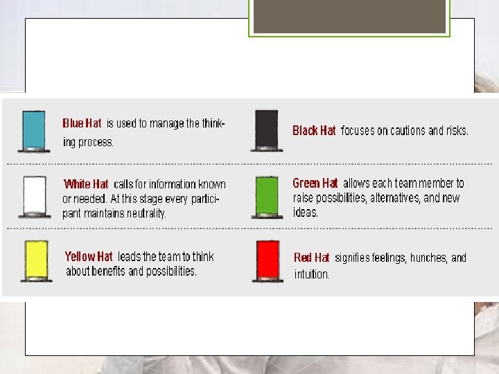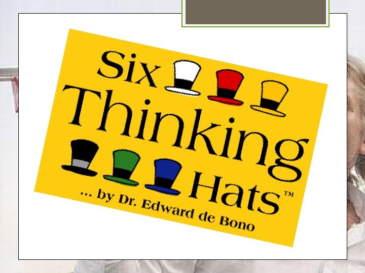 Edward de Bono is regarded by many to be the leading authority in the world in the field of creative thinking He is the originator of lateral thinking The Hats represent six thinking strategies, and if understood and applied, people could be more productive in meetings and in collaborating within groups and teams by deliberately using the approaches