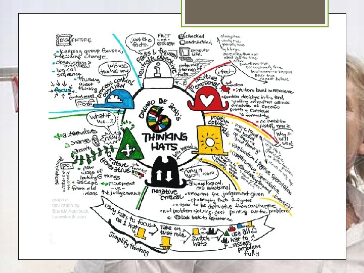 Brains and Hats Which hats do you think match each brain? Red – emotional thinking Yellow – positive thinking White – factual thinking Black – critical thinking Green – creative thinking Blue – leadership/management
