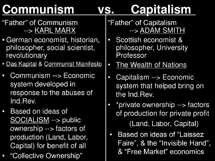 What is Communism? • • • An idea that a class struggle would lead to an overthrow of the class society. A classless society would mean that all production would be owned by the community. Nobody would be above anyone else, no one would be exploited, and no one would have more money than anyone else