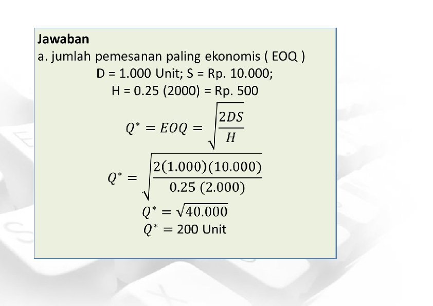 Jawaban contoh No. 2 Diketahui : S = Rp. 200, - per pesanan D = 60. 000 unit per tahun H = Rp. 0, 5, - per unit/tahun L = 10 hari • Jumlah Pemesanan Ekonomis (Economic Order Quantity / EOQ) :