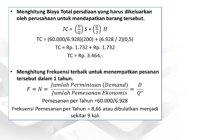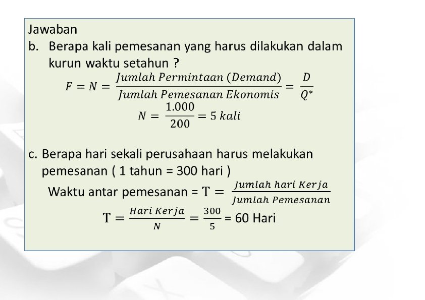 Contoh 1. Soal EOQ Beserta Pembahasannya • PT. SEJAHTERA pada tahun yang akan datang membutuhkan bahan baku sebanyak 1. 000 Unit. Harga bahan baku per unit adalah Rp 2. 000. biaya pesan untuk setiap kali melakukan pemesanan adalah sebesar Rp 10. 000, sedangkan biaya penyimpanan adalah sebesar 25% dari harga bahan baku (dari nilai rata – rata persediaan). Diminta : a) Berapa jumlah pemesanan paling ekonomis ( EOQ ) ? b) Berapa kali pemesanan yang harus dilakukan dalam kurun waktu setahun ? c) Berapa hari sekali perusahaan harus melakukan pemesanan ( 1 tahun = 300 hari ) ?