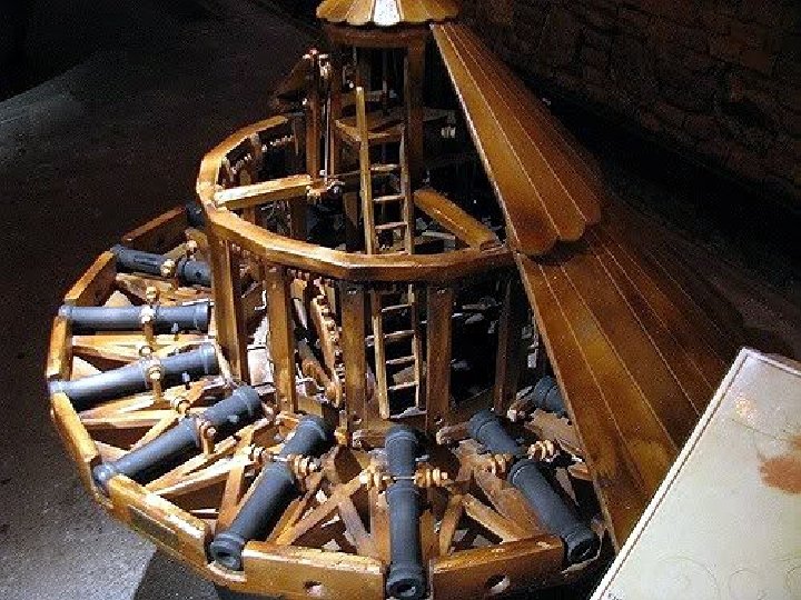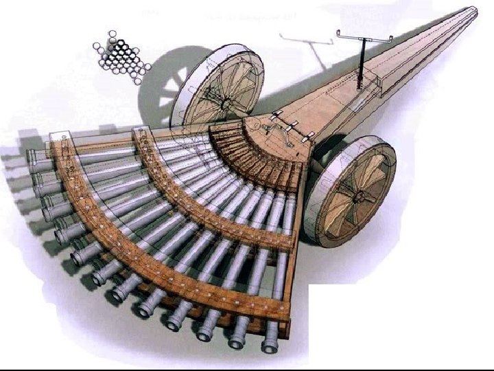 Leonardo Da Vinci dibujó esta batería de artillería de rodadura alrededor del año 1480. Es una suerte de llamado a un principio guerrero sobre la necesidad de un ingeniero de guerra. El objeto posee una manivela se ajusta la elevación y varias cargas.