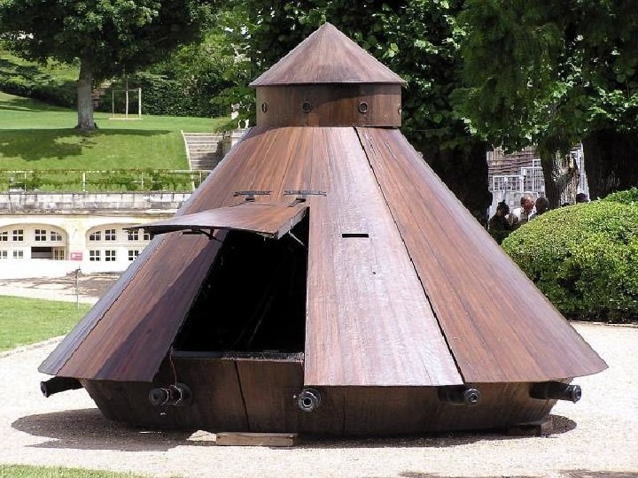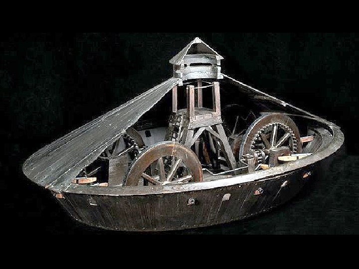 A este artilugio se le considera como el precursor de los tanques modernos. Se suponía que podía moverse en todas las direcciones, pero tenía un defecto importante: las manivelas para que lo hiciera iban en direcciones opuestas, de manera que era imposible mover el aparato hacia adelante. Hay expertos que piensan que un detalle así difícilmente habría sido pasado por alto por Da Vinci, y sospechan que quizás saboteó su propio diseño para que nunca fuera construido, pues en el fondo era un pacifista.