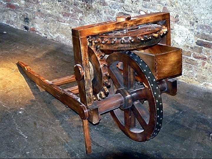 Un odómetro, (del griego camino y metro, medir. Que mide el camino). Un odómetro es un dispositivo que indica la distancia recorrida en un viaje por un automóvil u otro vehículo. El odómetro es ideal para medir trayectos y distancias en terrenos de superficies desiguales. Da vinci invento una carretilla de medir distancias. Cada 1, 5 metros, un eje da una vuelta y la rueda vertical avanza uno de sus treinta dientes. Cada 45 metros, ésta mueve la rueda horizontal y cae una canica a la caja. Mejora el de Herón de Alejandría y precede a los actuales medidores digitales.
