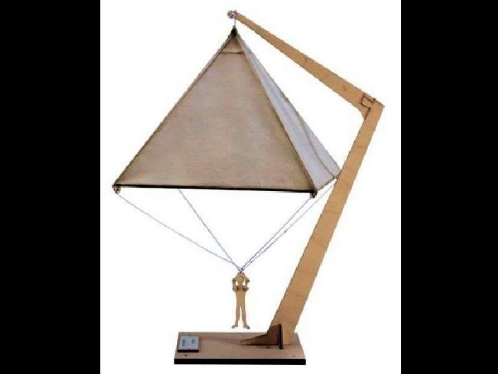 El proyecto de paracaídas de Leonardo es una estructura piramidal de base cuadrada con un lado y una altura de unos 7 metros. La evolución del paracaídas moderno, gracias al descubrimiento de nuevas fibras para tejidos y a los estudios para la regulación de la frenada de la caída, ha aportado soluciones considerablemente más fiables y seguras en la forma del casquete, y sobre todo, en la delicada fase de aterrizaje.
