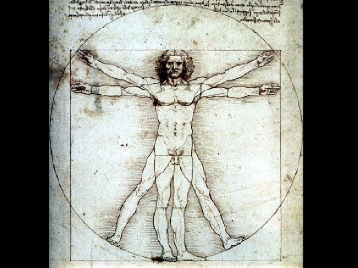 EL HOMBRE VITRUVIO Da Vinci modeló su forma humana perfecta basándose en las proporciones postuladas por Vitruvius, un antiguo arquitecto romano. El bosquejo que Da Vinci realizó buscando las proporciones divinas del ser humano esta acompañado de una larga nota en la que el maestro adjunta las indicaciones métricas y proporcionales del cuerpo y algunas observaciones como ésta : "la apertura de los brazos del hombre es igual a su altitud". La imagen es emblemática de la concepción humanista del hombre como microcosmos y de la teoría de las proporciones "ad quadratum" y "ad circulum". Hoy en día es una de las figuras humanas más reconocida del mundo.