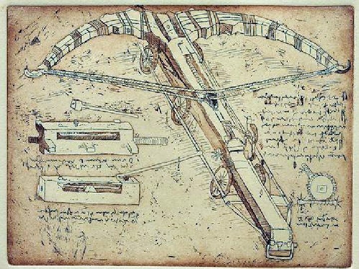 Consciente de que el temor que las armas podían infundir en los enemigos era tan importante como el daño que podían causar, Da Vinci creó este arco gigante. El tamaño era también un intento de aumentar el rango del misil, que no era una flecha, sino más bien una roca o una bomba. Sus vívaces dibujos de variaciones sobre este tema también indican que la idea subyacente era aterrorizar a los enemigos para que huyeran en vez de atacar.