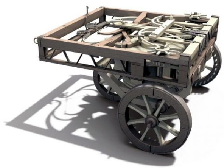 Usando varios bocetos que dejó en uno de sus códices, se ha podido construir un automóvil ideado hace más de cinco siglos por Leonardo da Vinci y capaz de recorrer varios metros. Está formado por un carro de madera con varios muelles ballesta para regular el movimiento, al tiempo que la propulsión proviene de dos muelles de espiral colocados en la parte baja del prototipo y que le permiten recorrer varios metros de forma autónoma. La máquina está dotada de un rudimentario diferencial, que permite controlar la dirección.