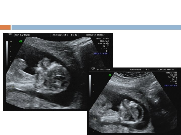 Risk of a cardiac defect NT measurement <95 th centile 2. 5 -3. 4 mm 3. 5 -4. 5 mm 4. 5 -5. 4 mm 5. 5 -6. 4 mm Above 6. 5 mm Cardiac risk 0. 16% 1% 3% 7% 20% 30%