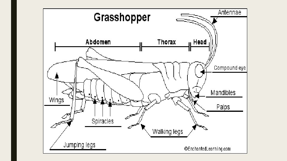 Arthropods ■ Phylum: Arthropoda (arthron = “joint, ” podos = “foot”) – Spiders – Centipedes – Insects – crickets, grasshoppers, etc – Crustaceans (crayfish, lobster) ■ Arthropods appeared in the sea about 600 million years ago and have since colonized freshwater habitats, land, and air.