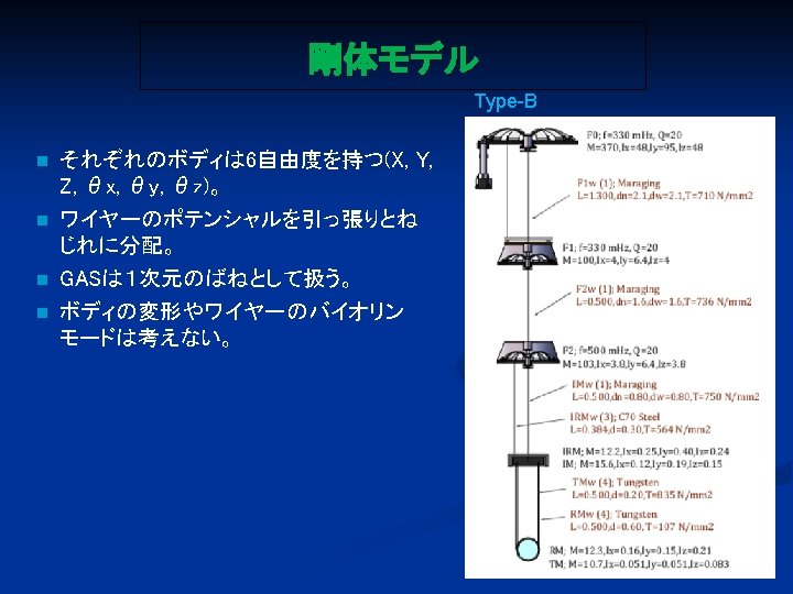 KAGRAにおける防振システムの配置 Type-A IP + GASF (5 stage) + Payload (23 kg, cryogenic) Type-B IP + GASF (3 stage) + Payload (10 kg/20 kg) Type-C Stack + Single/Double-pendulum (~ 1 kg)