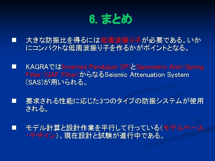 Seismic Attenuation System (SAS) KAGRAではIPとGAS filterから構成される Seismic Attenuation System (SAS) が採用さ れている。 (1)観測帯域(>10 Hz)における防振 Standard filters & Mirror suspension (2)RMS変位/速度の低減 Pre-isolator (IP + Top filter) SASは国立天文台に設置されている300 m レーザー干渉計重力波検出器TAMA 300にお いて開発、実証された。 TAMA-SAS